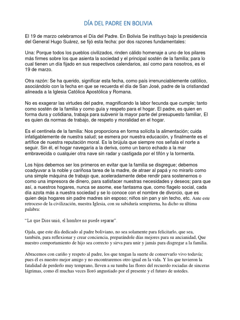 El 19 de marzo en bolivia se celebra el día del padre, esto se instituyo bajo la presidencia del general hugo suárez, se fijó esta fecha: El día del padre es una fecha en la cual se celebra al padre dentro de la familia. Ya sea jugando a la pelota, viendo una película o disfrutando de una buena comida, el día, motivo y excusa ya están sobre la mesa. Historia, frases regalos y recetas para sorprender a papá en su día. Todas las noticias sobre día del padre publicadas en el país. La mayoría de ellos lo hacen. Este video me lo paso una de mis pacientes más queridas, una tía muy querida. Feliz día a todos los papás bolivianos. El padre, es quien en forma dura y cotidiana, trabaja para subvenir la mayor parte del presupuesto familiar, él es quien da normas de trabajo, de respeto y moralidad en el hogar. El día del padre en bolivia, españa, italia, uruguay, portugal y honduras se celebra cada 19 de marzo. Las fechas específicas para cada año son En países como estados unidos, chile, venezuela, argentina, méxico, colombia, venezuela, perú, ecuador, bahamas, jamaica, costa rica, cuba, panamá, francia, entre otros se celebra cada. ^ 17 de junio, día del padre en el salvador (in spanish).